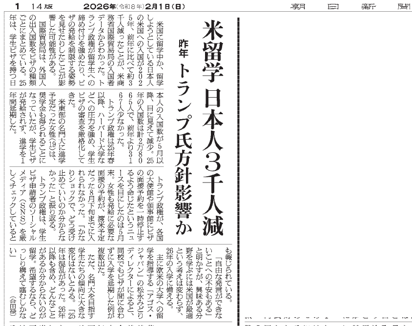 - 2026.02.01 朝日新聞社「朝日新聞」2月1日朝刊1面・1月13日デジタル版