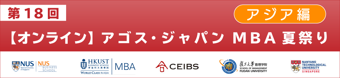 海外トップ大学・大学院留学準備指導校を運営する株式会社アゴス・ジャパン(代表取締役:横山 匡、本社:東京都渋谷区)は、2021年8月15日(日)に、アジアMBAトップ校の日本人卒業生・在校生がオンラインで集結する「アジアMBA夏祭り」を開催いたします。