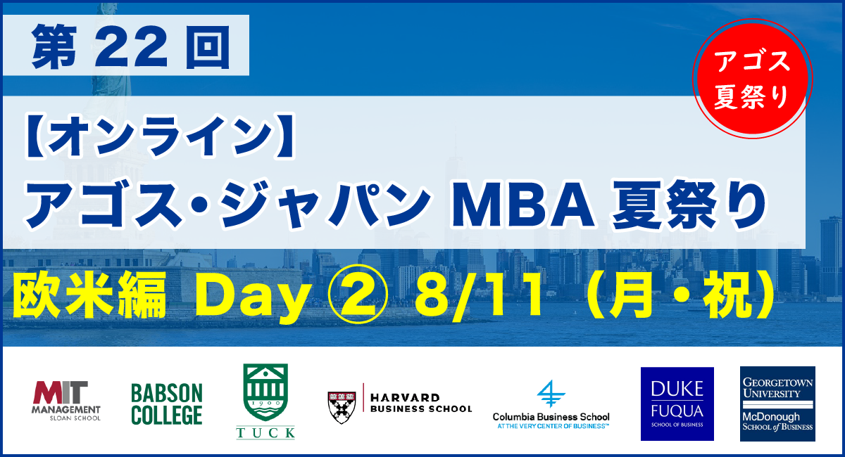 海外トップ大学・大学院留学準備指導校を運営する株式会社アゴス・ジャパン(取締役会長:横山 匡、本社:東京都渋谷区)は、ハーバード・コロンビア・MIT等、欧米トップスクール10校の日本人卒業生・在校生がオンラインにて集結する、「第22回 アゴス・ ジャパン MBA夏祭り 欧米編 Day2」を2025年8月11日(月・祝)に開催いたします。