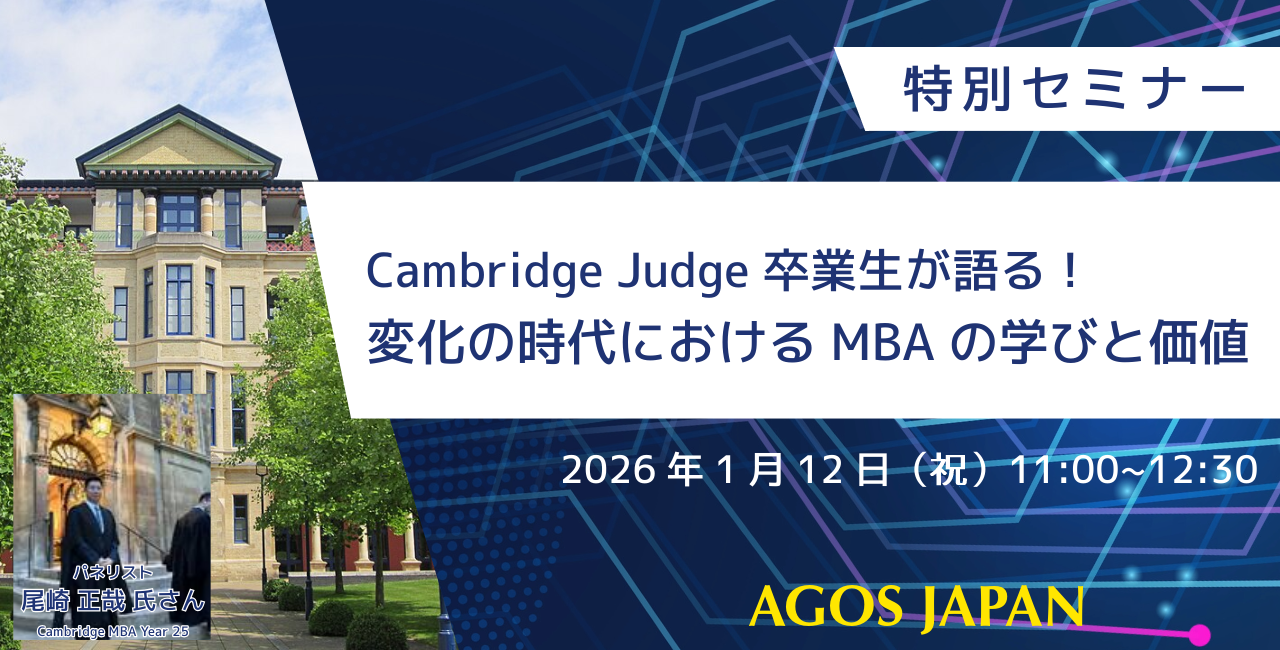 海外トップ大学・大学院留学準備指導校として国内屈指の合格実績・テスト対策教材開発・教授指導ノウハウを誇る株式会社アゴス・ジャパン(取締役:横山 匡、本社:東京都渋谷区、以下 アゴス・ジャパン)は、2026年新年特別セミナーとして、Cambridge Judge Business Schoolを卒業された尾崎様をお招きして、MBA前のキャリア形成や価値観の変化、MBAでの学びを通じて得た再発見、そして卒業後に見えてきたキャリアの方向性やリーダーシップの進化について、じっくりと語っていただくオンラインセミナー 『Cambridge Judge 卒業生が語る!変化の時代におけるMBAの学びと価値』を2026年1月12日(祝・月)11時より開催いたします。