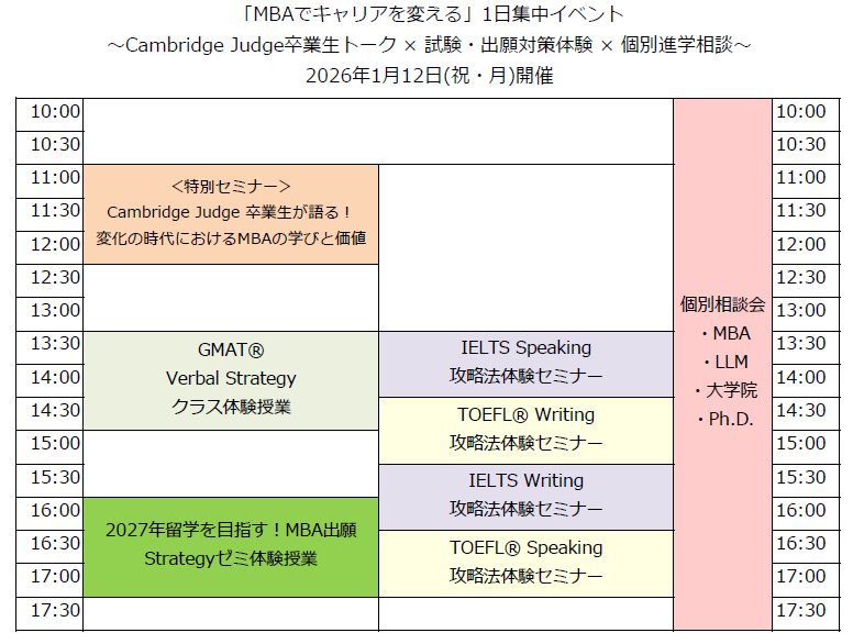 さらに同日には、海外MBA留学に必須となる「TOEFL(R)/IELTS」「GMAT(R)」のスコアアップに直結する体験授業に加え、出願書類の土台となる学校選択、カリキュラム調査をテーマにした体験授業もご用意しています。