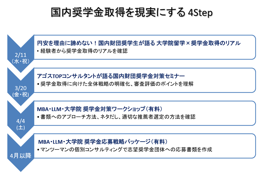 本セミナーでは、国内主要奨学金団体への支援実績を有するアゴス・ジャパンのトップコンサルタントが、奨学金獲得に向けたポイントを体系的に解説します。