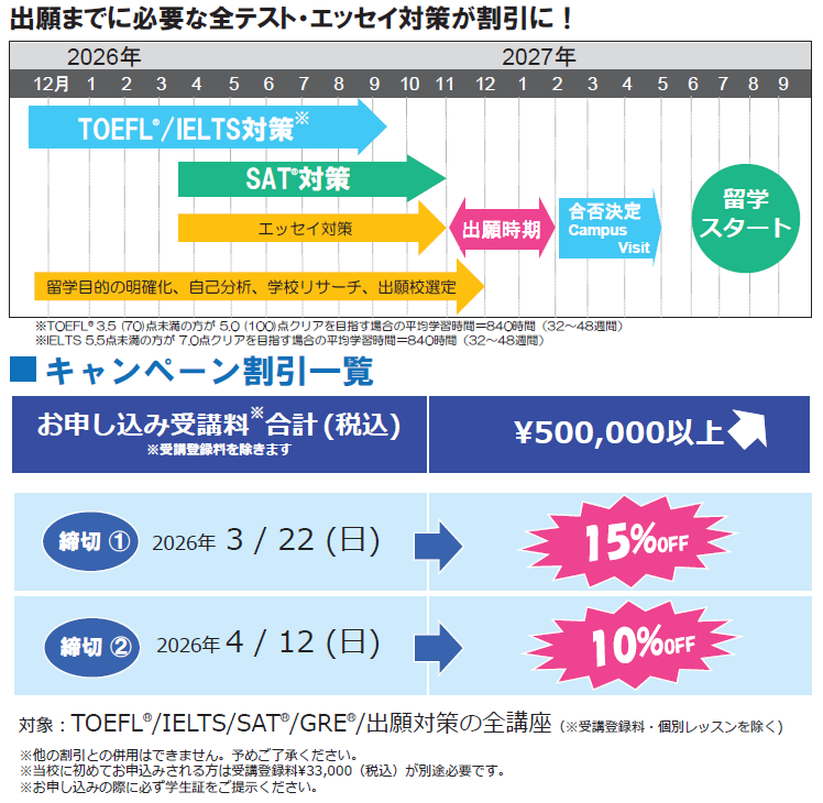 アゴス・ジャパンでは、この春からTOEFL(R)・IELTS・SAT(R)などの試験学習や出願対策を開始する学生を応援します。早期に留学準備を開始して、確実に目標スコア達成を目指そう!(PDFはこちら)