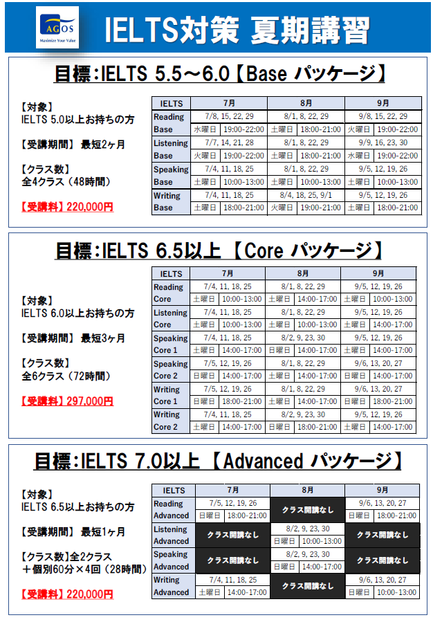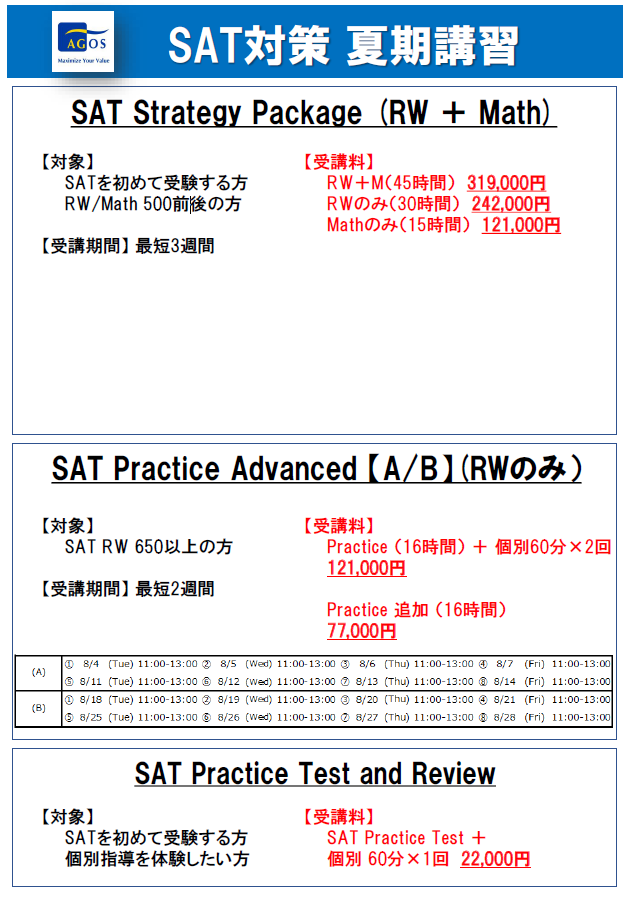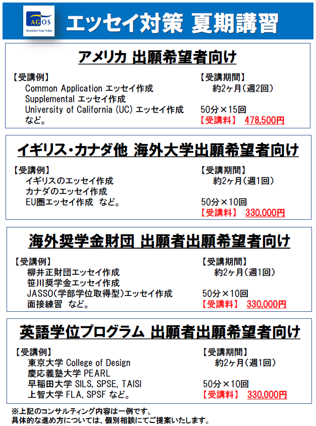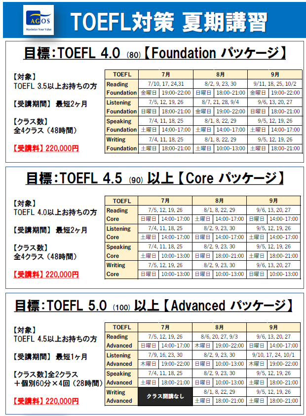 アゴス・ジャパンは、大学留学・MBA/大学院留学を目指す人たちのためのテスト対策、出願対策の指導専門校として30年以上にわたり、スコアアップ・合格実績を上げてきた独自のメソッドによる専門校です。海外トップ大学・大学院に多くの合格者を輩出してきたアゴス・ジャパンだからこそできる、世界に通用する英語教育をお試しください。
